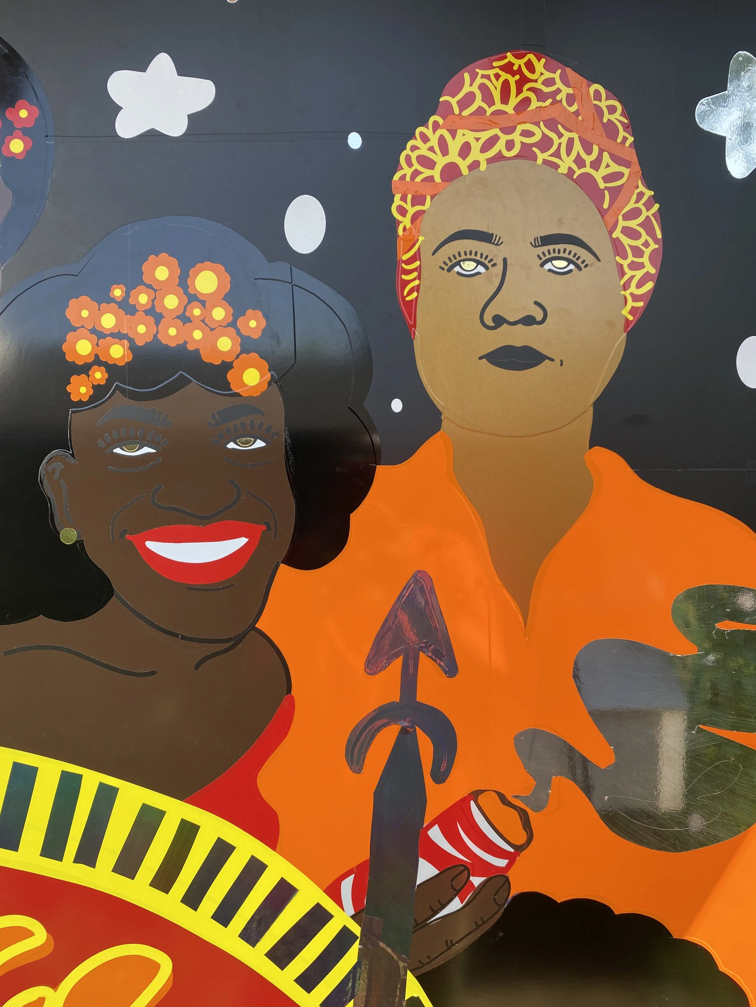 The fire oven it adorns isn’t just for cooking—it’s for nourishing. Meals are prepared with purpose: from community care shares and ancestral cooking classes to BIPOC mentorships and fellowship feasts. The mural watches over every simmer, roast, and flame-lit gathering, reminding us that care work, creativity, and resistance all belong in the kitchen.